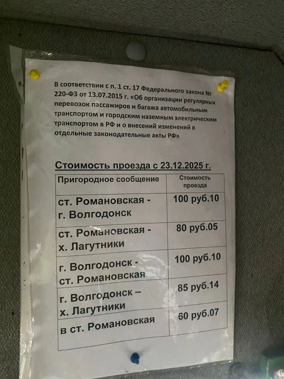 Проезд между Волгодонском и Лагутниками и обратно теперь стоит 85 рублей, между Лагутниками и Романовской – 80 рублей. Стоимость проезда по станице Романовской составляет 60 рублей (один из самых дорогих тарифов в Ростовской области). Любопытно, но на объявлении в автобусе о повышении стоимости проезда цены указаны с копейками.