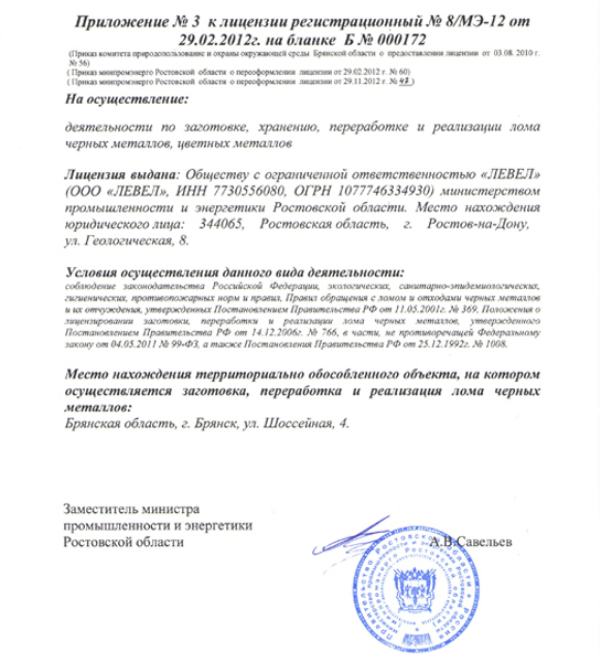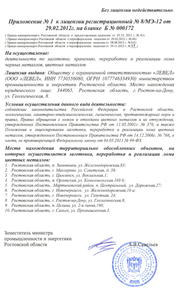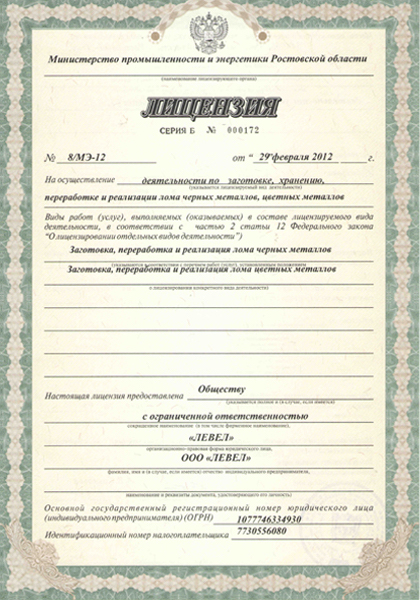 ООО «ЛЕВЕЛ» принимает по высоким ценам на площадке в Цимлянске широкий спектр лома черных и цветных металлов. Компания работает как с физическими, так и с юридическими лицами по всему Волгодонскому и Цимлянскому районам. Работа лицензирована в Министерстве промышленности и энергетики Ростовской области.