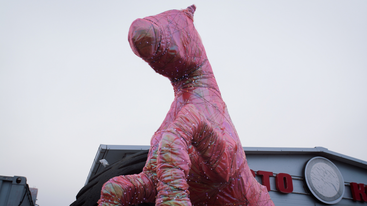 Внушительная скульптура из металла, укутанная в органзу и светодиоды, приветливо взирает на проносящийся мимо поток автомобилей по улице Прибрежной.