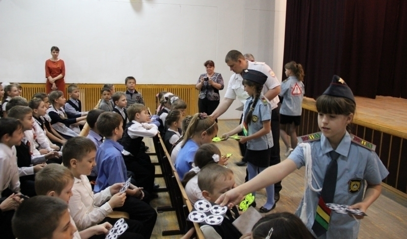 Школьники приняли активное участие в проведении занятия, задали интересующие вопросы и наклеили светоотражающие смайлики, подаренные им сотрудниками ГИБДД.