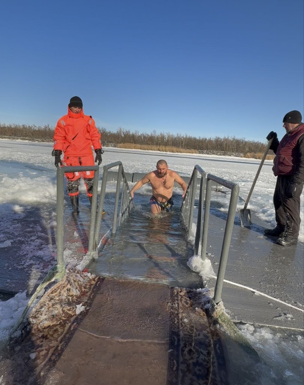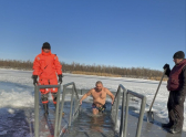 Погода в понедельник выдалась по-настоящему крещенской: морозной и солнечной. Перед прорубью спортсменов благословил Отец Михаил. Он окропил всех святой водой.