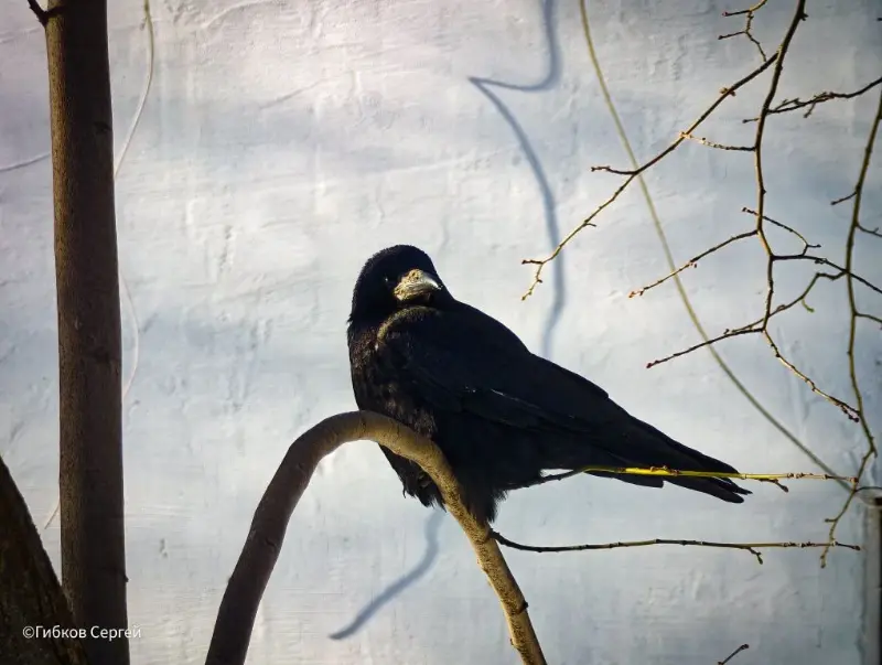А тут птица села на ветку и как будто позирует для фото. Сидит гордо! Что-то себе думает! Чёрная птица на белом фоне - типичная зимняя зарисовка.