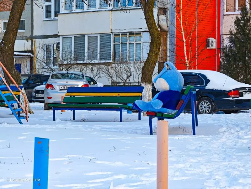 В одном дворе чья-то мягкая игрушка сидит на скамейке, может ждет кого-то? Может ее бросила хозяйка, а может просто выгуливает на свежем воздухе.