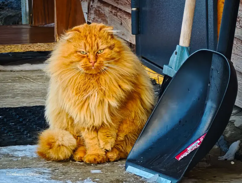 А этот рыжий пушистый кот, наверное, вышел проверить, как убирают снег. Смотрит недовольно – то ли работой недоволен, то ли зимой в целом. Милый такой контролёр.