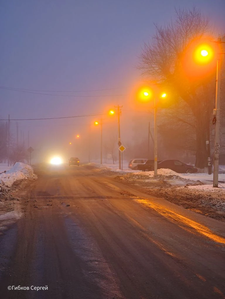 Вечером фонари светят сквозь туман – пытаются, но пар от земли мешает. Всё в золотистом свете, уютно!