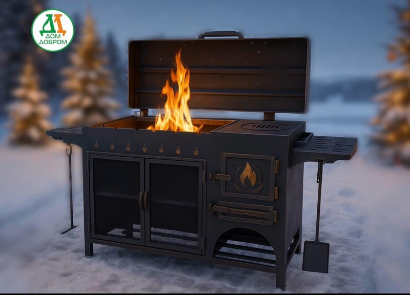 Комплектация: жаровня, печь под казан, две боковые полки, шкаф-дровник, крышка, дымоход, кочерга, совок