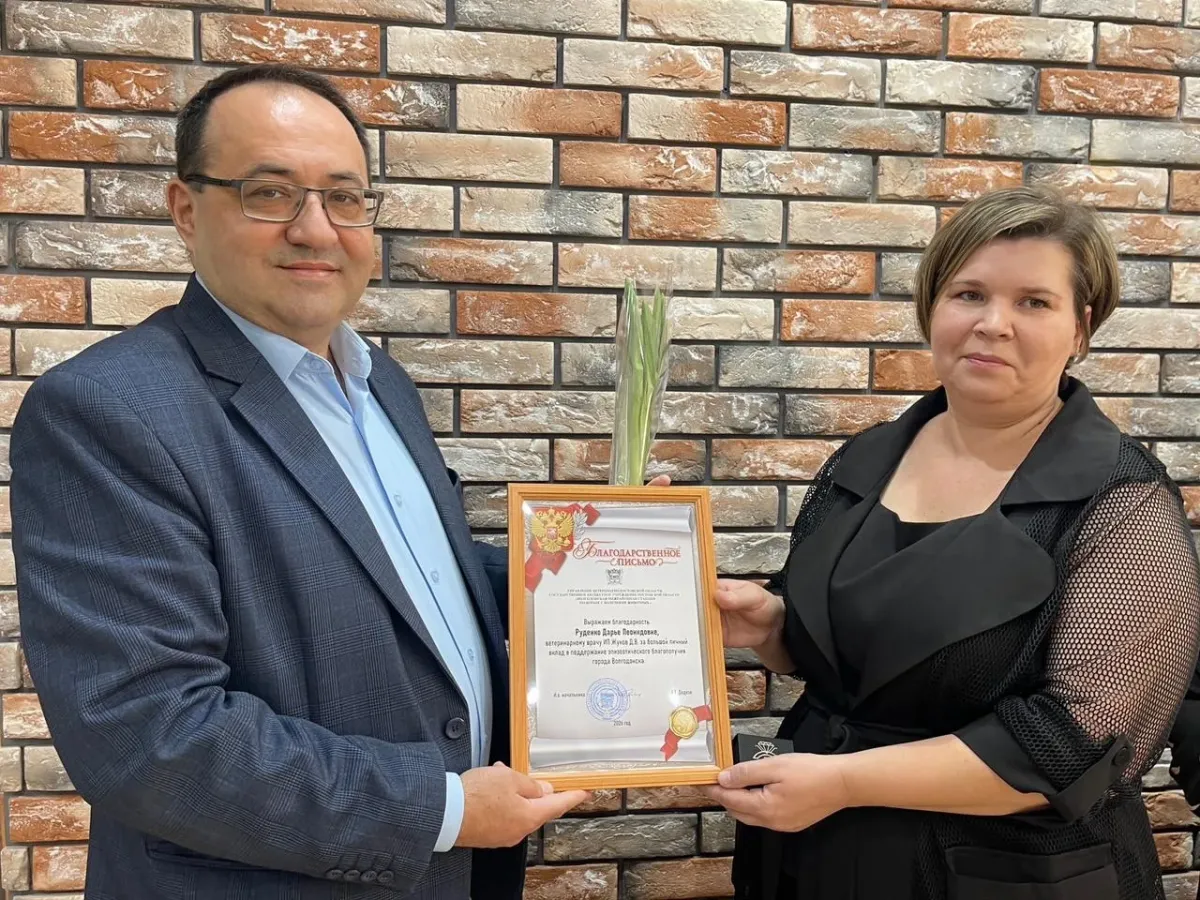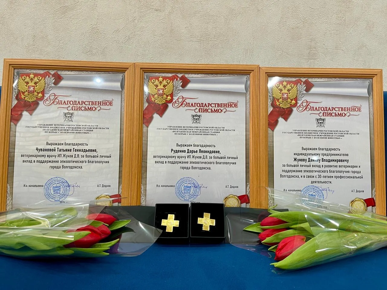 В день 30-летнего юбилея ветеринарный центр чествует врачей, чьи имена стали синонимом качества и преданности делу – Татьяну Геннадьевну Чувакову и Дарью Леонидовну Руденко. И.о. начальника Волгодонской межрайонной станции по борьбе с болезнями животных Алишер Дедков вручил им высшие знаки отличия — золотые значки «Ветеринарные врачи Дона». Это не просто награда. Это признание. Признание тысяч спасённых жизней, возвращённой радости в семьи и титанического труда, который длится три десятилетия.
