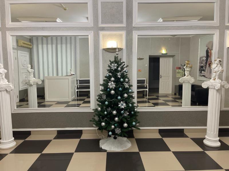 После 10 декабря сотрудники ЗАГСа украшают учреждение новогодней символикой. Нарядные елочки стоят в каждом зале - большом и малом, в холле, в комнате жениха и невесты.