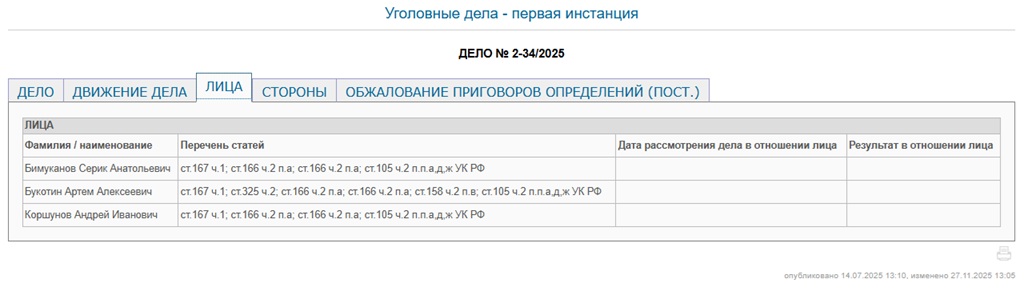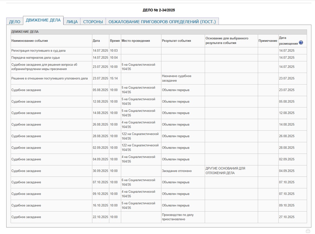 Но фигурантами судебного процесса, как следует из базы данных Ростовского областного суда, стали только трое: сам Серик Бимуканов, а также Артем Букотин и Андрей Коршунов. Имя Ильяса Ашикенова уже не упоминалось. В суде дело было зарегистрировано 14 июля 2025 года. С июля по октябрь было назначено 12 судебных заседаний, из которых одно было отложено. Но 22 октября производство по делу было приостановлено. Причина этого не указывается.