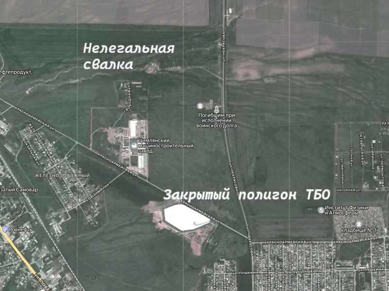 Хорошо заметная на космических снимках нелегальная свалка возникла в балке, впадающую в долину реки Кумшак, по дороге к закрытому аэропорту несколько лет назад. От нового кладбища свалка находится на расстоянии около 300 метров, от закрытого городского полигона ТБО – на расстоянии одного километра. Общая площадь загрязненных отходами участков земли превышает несколько гектаров. В период таяния снегов или после сильных дождей токсичные стоки с территории свалки могут легко попасть в реку Кумшак, а оттуда и в Дон.