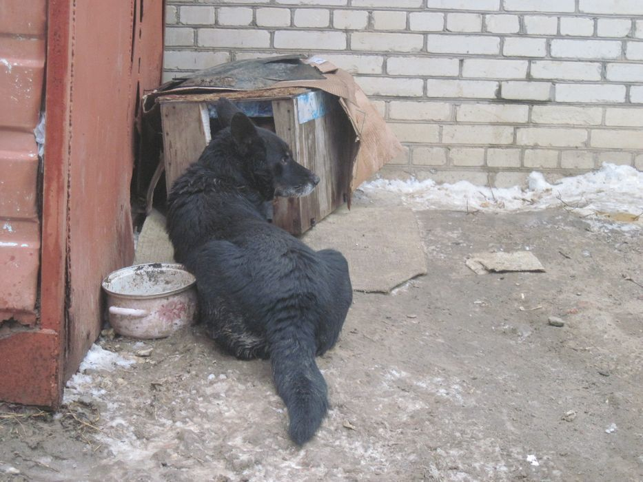 Здоровенный кобель обосновался на краю проезда возле гаражей, рядом с маленькой собачьей будкой.