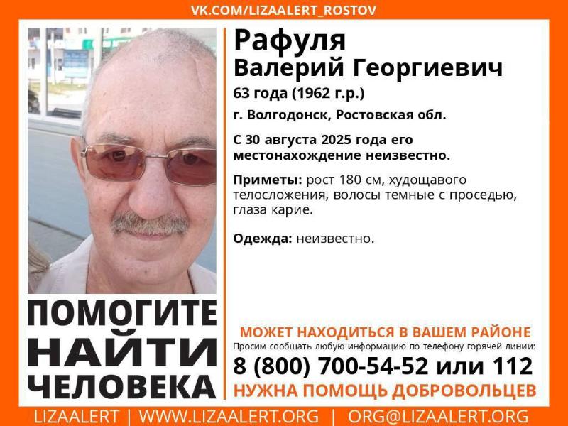 В Волгодонске пропал 63-летний Валерий Георгиевич Рафуля, который пропал без вести 30 августа 2025 года.