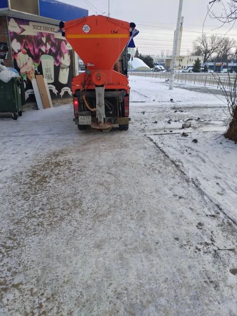 В Волгодонске провели обработку тротуаров пескосоляной смесью после снегопада