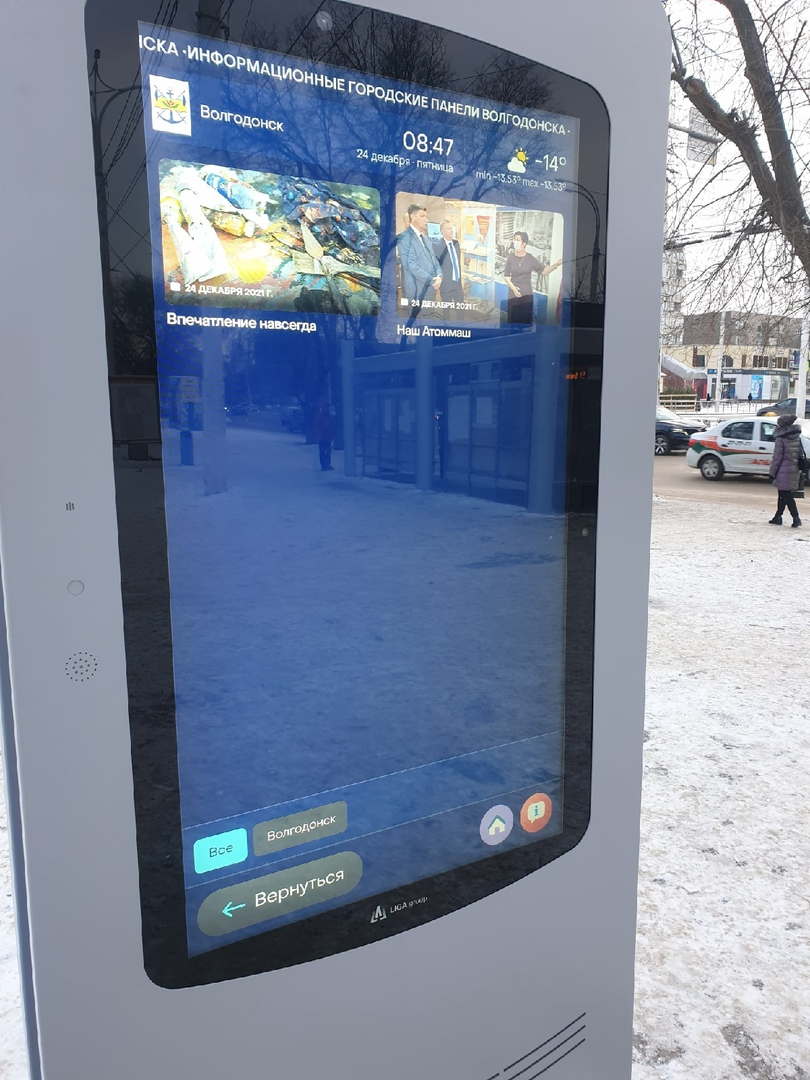 На экране киосков отображается температура воздуха, время, расписание городских мероприятий, ссылки на сайты некоторых городских учреждений и общественных проектов. Пока база данных киосков только наполняется.