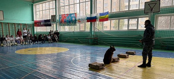 В завершение встречи сотрудник кинологической службы и его питомец продемонстрировали элементы дрессуры. Служебная собака показала свои навыки, четко выполняя команды сотрудника полиции.