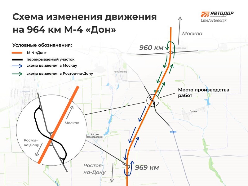 Как сообщили в «Автодоре», с 27 января 2026 года на 964 км М-4 «Дон» в связи с реконструкцией путепровода вводится изменение схемы движения. Теперь разворот в направлении Ростова-на-Дону будет предусмотрен на 960 км трассы. Разворот в направлении Москвы возможен на 969 км М-4 «Дон».