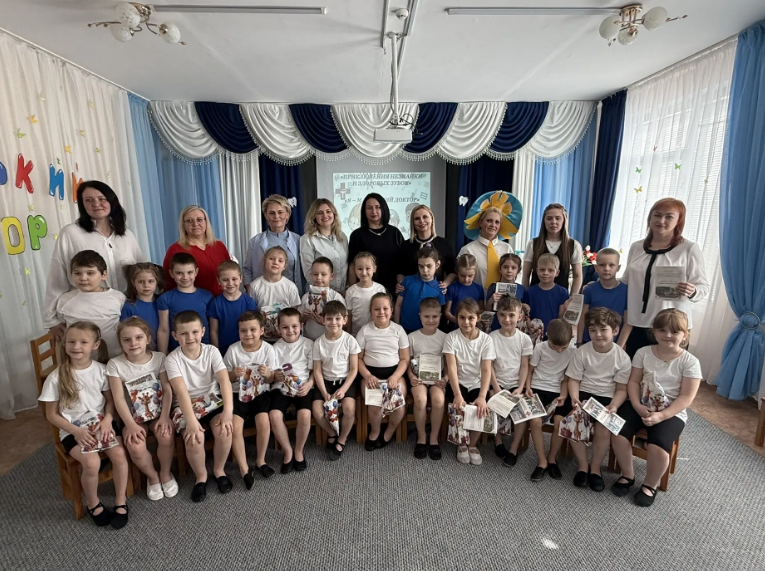 Юным участникам познавательного урока подарили детские зубные щетки и пасты. Воспитанники дошкольных учреждений познакомились с навыками перевязок и теорией здорового образа жизни.