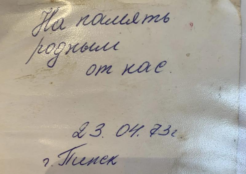 Обратная сторона черно-белого снимка с подписью