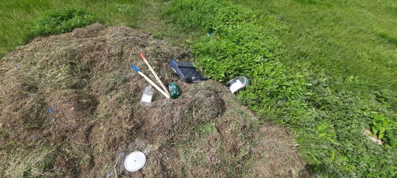 Прибыв к памятнику, волонтеры увидели, что новая синяя краска, как утверждает Надежда Михайловна, была нанесена «похабно» поверх старой, а у подножия братской могилы был брошен мусор. Пустые банки из-под краски, валики и другие отходы, которые местные рабочие не удосужились убрать.
