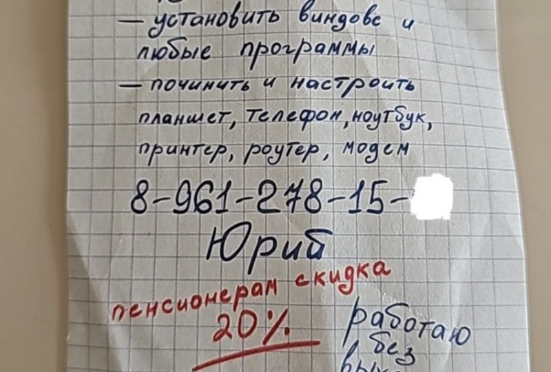 Объявление от «мастера Юрия» она обнаружила в собственном почтовом ящике. «Юрий» сулил скидку пенсионерам в целых 20% за свои услуги. На самом же деле стоимость его работ, по словам женщины могла быть завышена почти 7 раз и оказалась сопоставимой со стоимостью нового бюджетного ноутбука.
