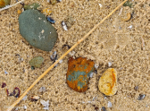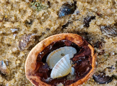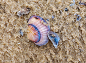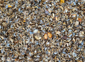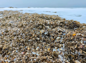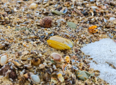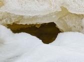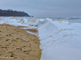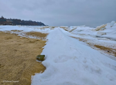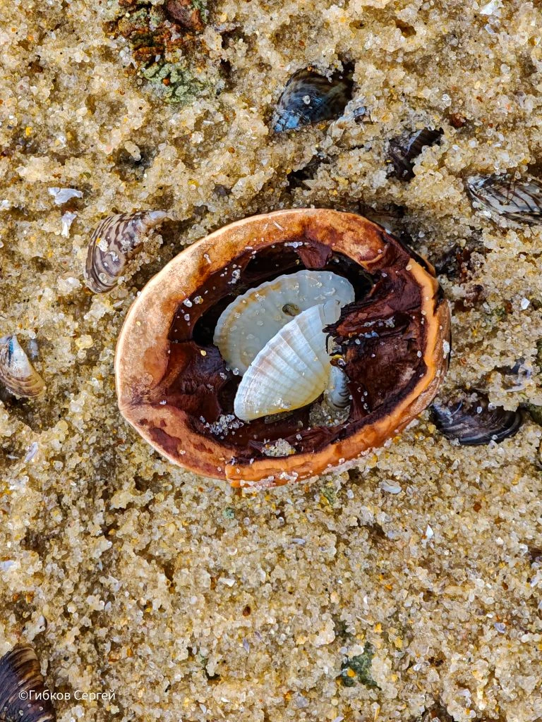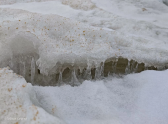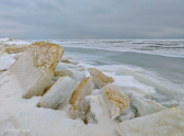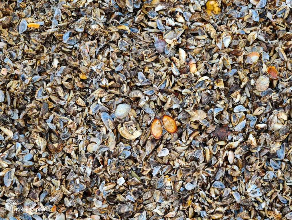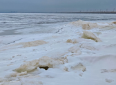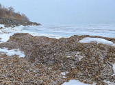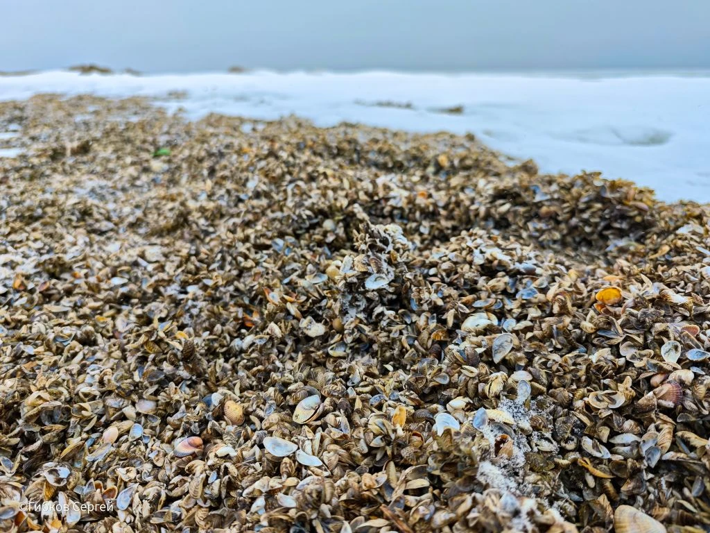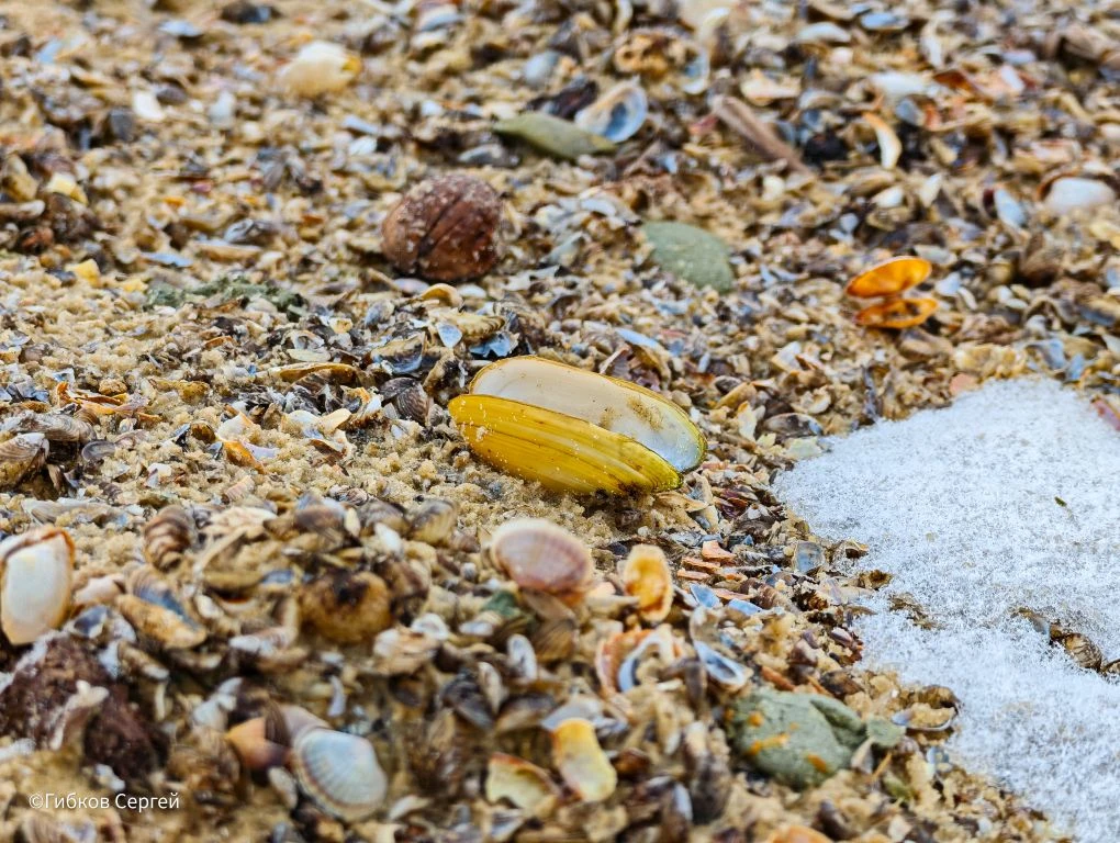 Берег искусственного моря оказался завален льдинами и снегом. А для любителей биологии и палеонтологии здесь можно найти и интересные вещи: окаменелости и панцири современных моллюсков и улиток.