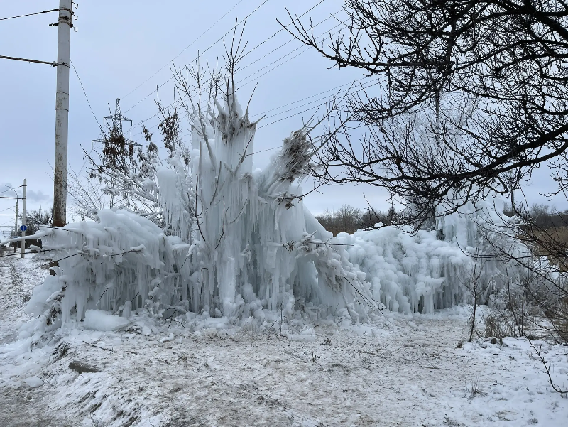 Волгодонцы обнаружили необычное и красивое явление природы прямо у дороги! На Жуковском шоссе, напротив «Атоммаша», образовалась настоящая ледяная скульптура, моментально ставшая местной достопримечательностью.